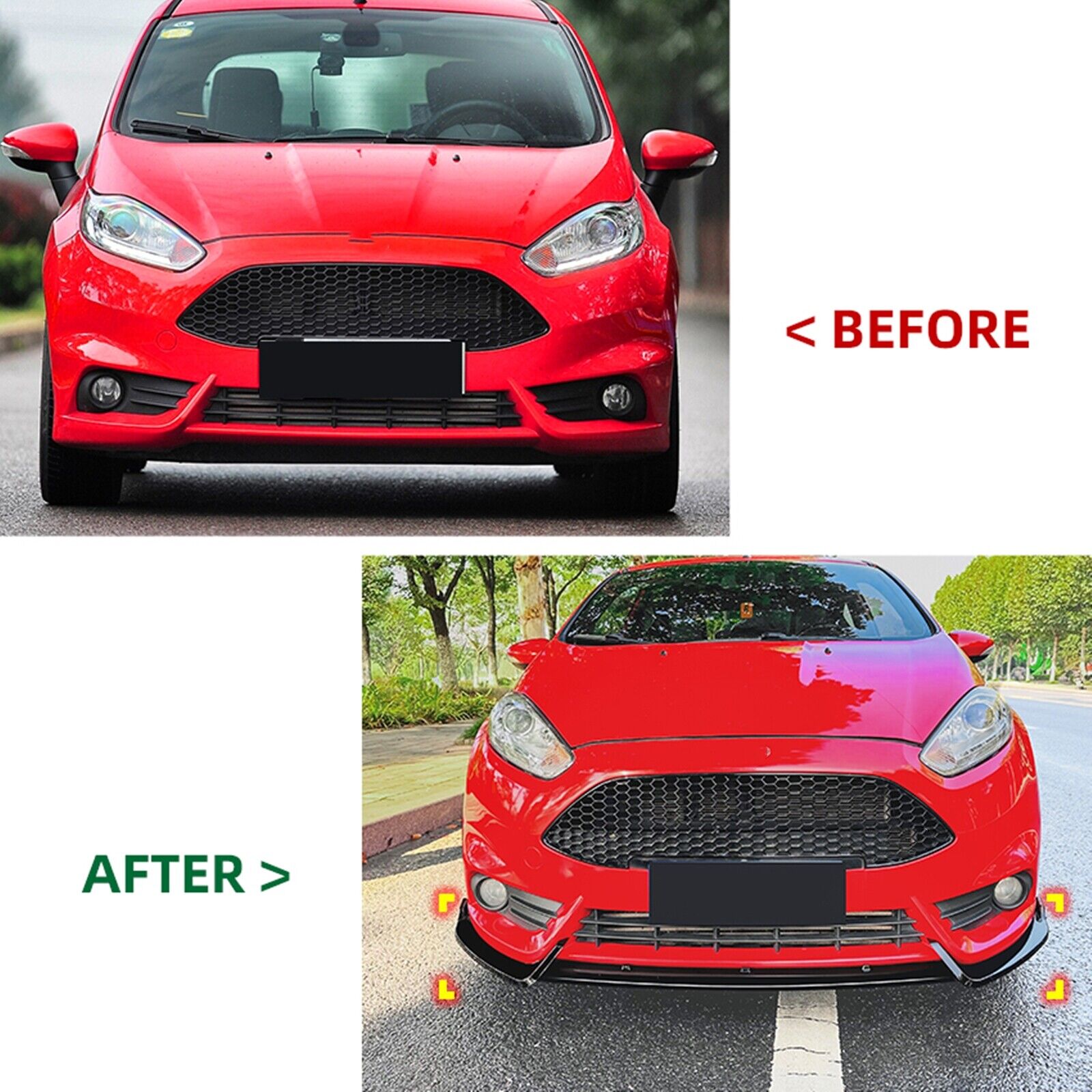 Specifications : Color : Gloss Black Installation : Direct ReplacementMaterial : High Quality ABS PlasticPlacement on Vehicle : FrontPackage Including : 3PCS/1SET Front Bumper Spoiler LipFitment : For Ford Fiesta ST MK6 2012-2017 ( After June 2012 )For Ford Fiesta MK6 2008-2017 ( Known as MK7 in ) not fit SE versionFor Ford Fiesta 2011-2019 (North America) not fit SE versionFor Ford B-Max B232 2012-2017Features :- Easy install and durable use. Strict quality control standards to Build and test.- Enduring, different optical line comes from different points of view.- It'll give you excellent look , Note :- -Please allow 0.5-1 inch difference due to manual measurement. (1inch=2.54cm)-Please compare the pictures to make sure it fits before purchase,If you have questions,Please contact us.*