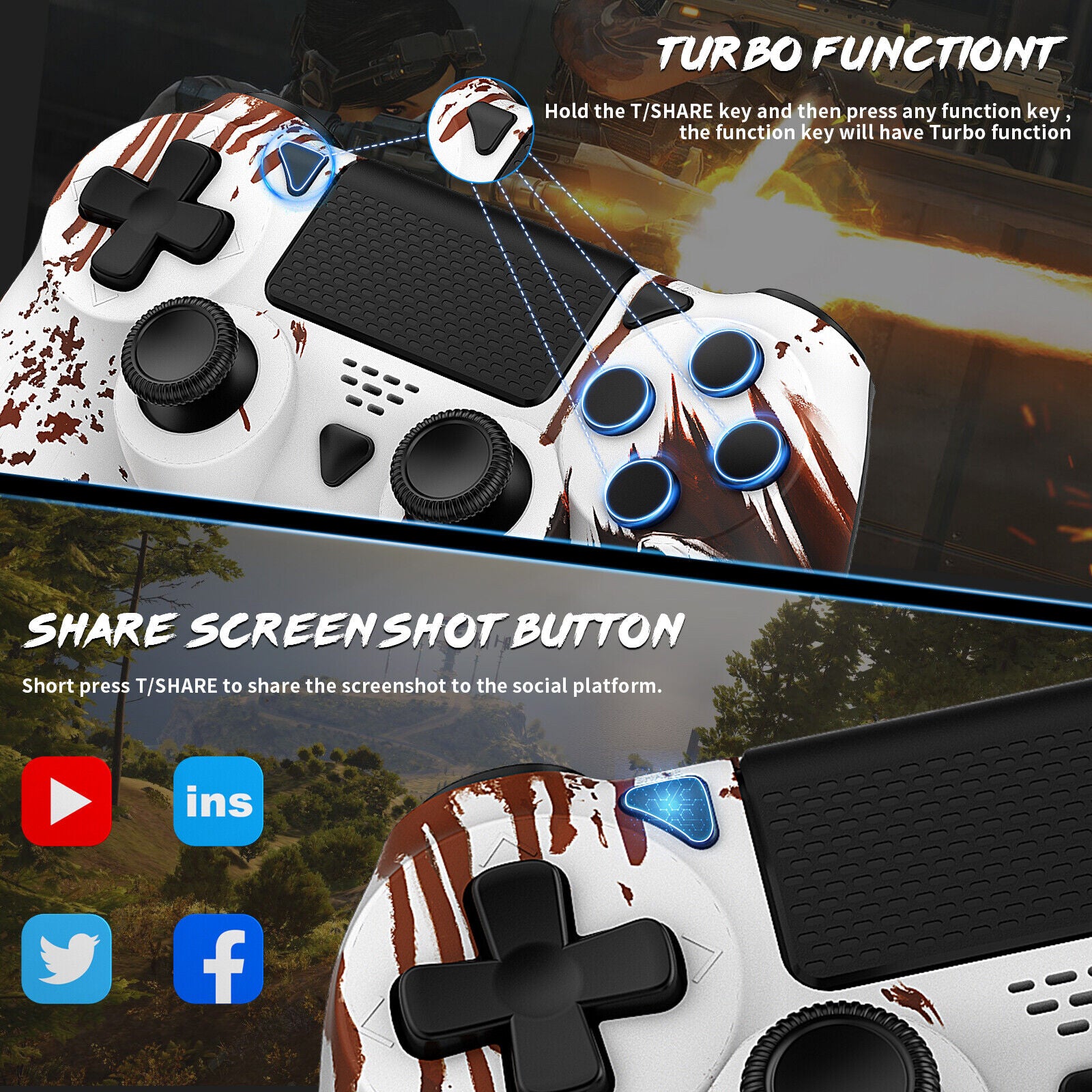 1.The handle supports Turbo function, press and hold the T/SHARE key, and then press the function key, then the function key has Turbo burst function, SHARE key and Turbo key are the same key, press it to enable Share;